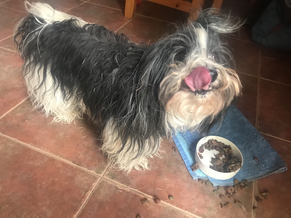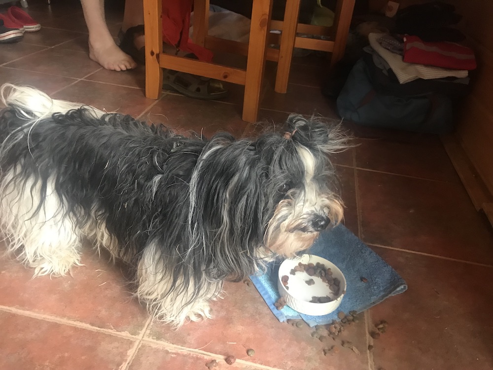 Herrchen hat für mich ganz leckeres Futter gekauft, Pastete! Sonst kriege ich unterwegs ja fast nur Trockenfutter, aber hier gibt es ja einen Kühlschrank. Blöd ist nur, dass ich immer so viel von den trockenen Brocken beiseite räumen muss, bis ich dran komme.