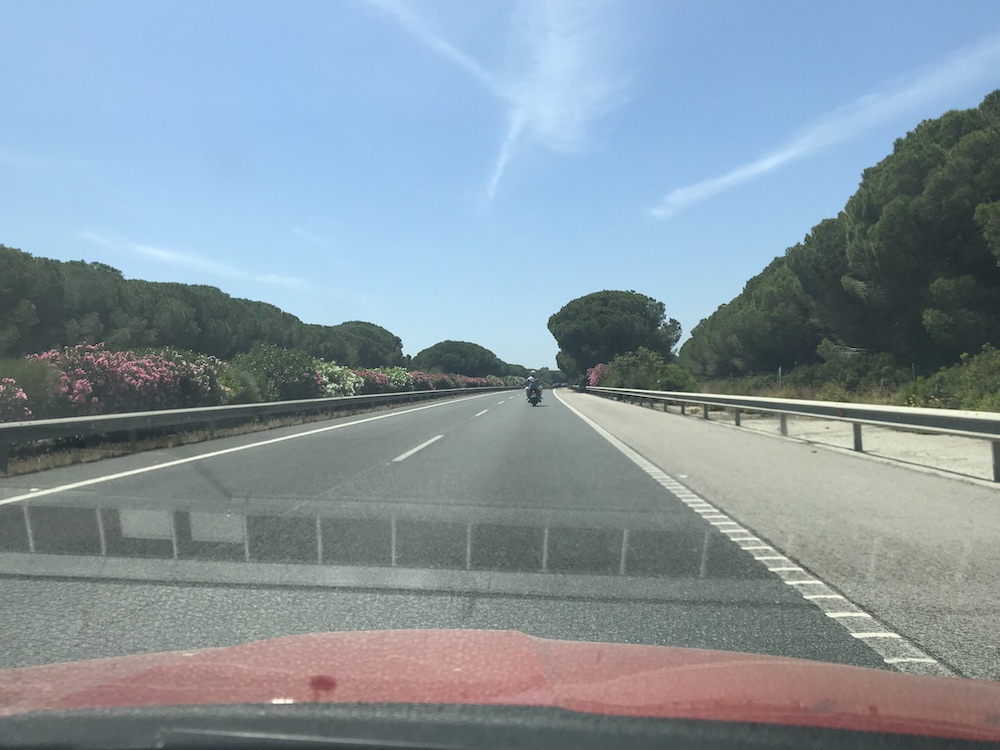 Endlich wieder mal im Zelt. Angenehme Reise, immer unterlegt mit „Schau, da blüht der Oleander!“ und „Olivenbäume, soweit das Auge reicht!“ oder „Siehst du die Burg?“ (natürlich sieht er sie, er sitzt neben ihr, er müsste blind sein) und solche Sachen halt.