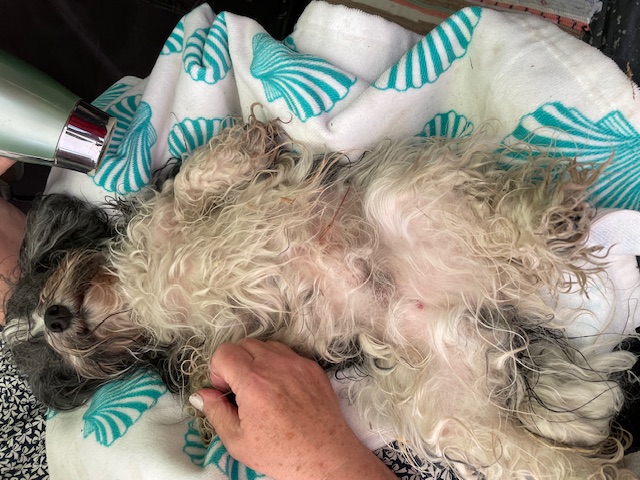 Deshalb müssen sie mich dann auch föhnen, DAS mag ich allerdings schon. Blöd nur, dass Frauchen dann meistens auch mit der Bürste anrückt.