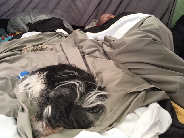 Frauchen liest, spricht mit ihrem leuchtenden Kästchen und macht Kaffee und doofe Fotos.