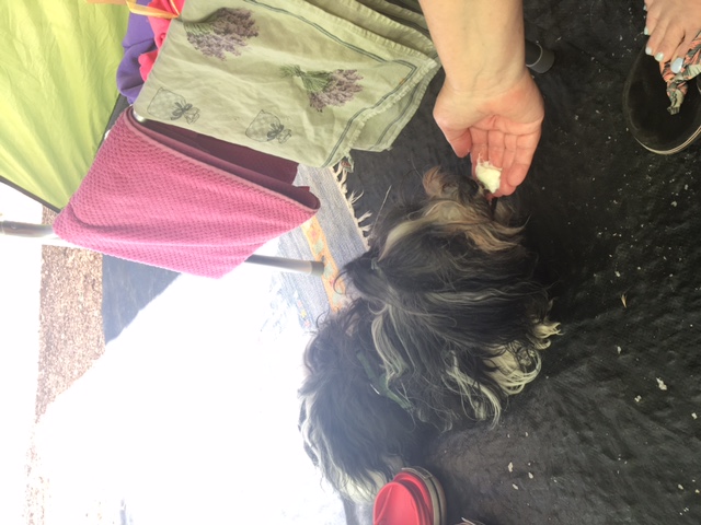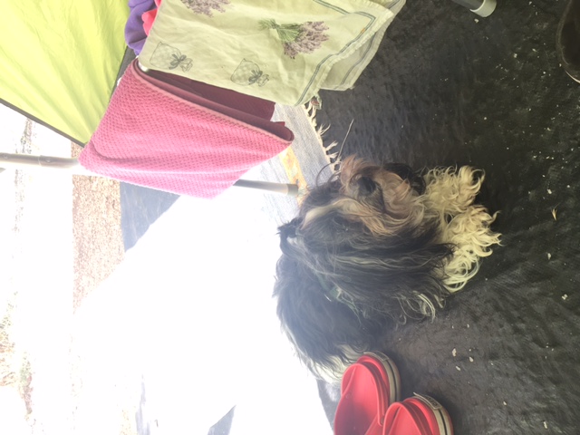 Gemütliches langes Frühstück für die Menschen, das heißt auch für mich: einfach abhängen. Natürlich erst, nachdem ich meinen Anteil abgeholt habe. Ich bin dann immer ein ganz geduldiger Hund (das mögen sie), so muss ich nie lange warten. Heute gab es Yoghurt, das mag ich richtig gerne.