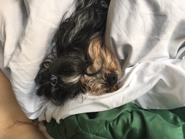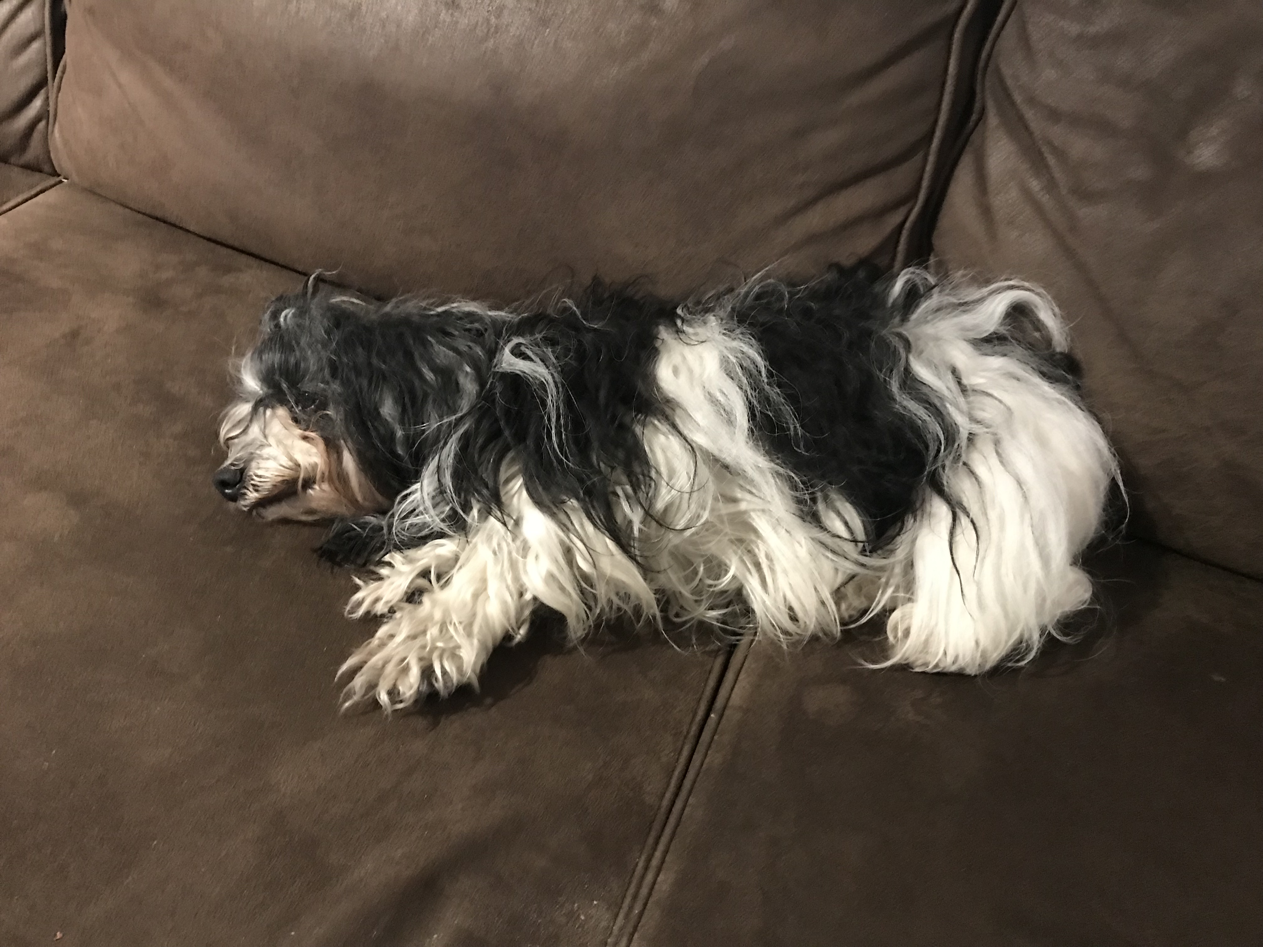 Ich bin nur nicht ganz sicher, ob da nicht noch was auf mich zukommt, Frauchen hat nämlich die Bürste in der Hand. Vielleicht, wenn ich ganz fest schlafe, lässt sie‘s ja bleiben………………..