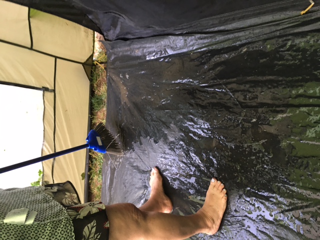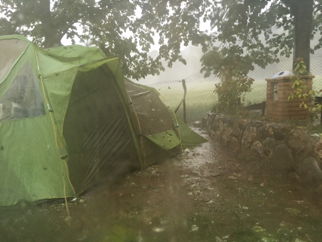Dann kam das Unwetter. Ich bin ja immer schon dafür bekannt, dass ich Gewitter im Zelt nicht mag, aber heute sind wir alle gemeinsam ins Auto geflüchtet, weil die Hagelkörner (so heißt das, glaube ich) immer größer geworden sind. Jetzt hat das Zelt drei Löcher und für meine Menschen war‘s mit Ruhe und Erholung vorbei.